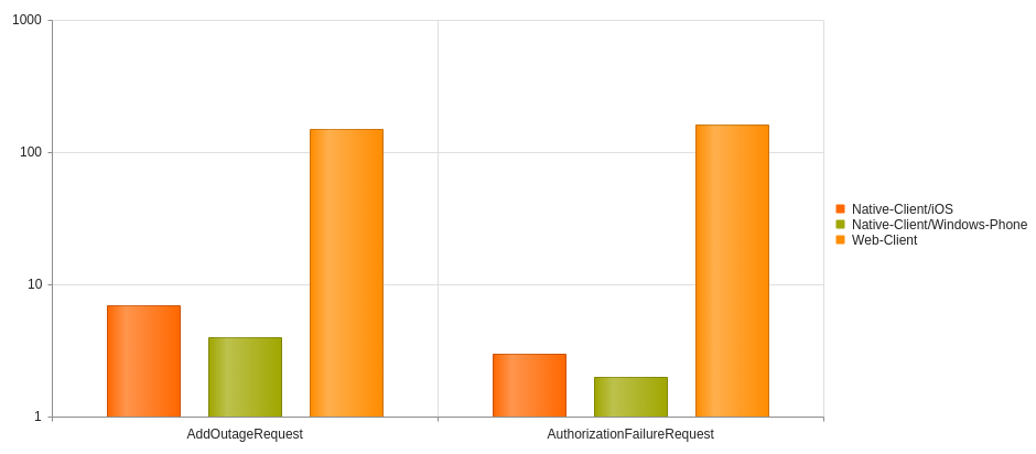 [ { "data" : [ { "client" : "Native-Client/iOS", "count" : 7 }, { "client" : "Native-Client/Windows-Phone", "count" : 4 }, { "client" : "Web-Client", "count" : 149 } ], "type" : "AddOutageRequest" }, { "data" : [ { "client" : "Web-Client", "count" : 161 }, { "client" : "Native-Client/iOS", "count" : 3 }, { "client" : "Native-Client/Windows-Phone", "count" : 2 } ], "type" : "AuthorizationFailureRequest" }, { "data" : [ { "client" : "Native-Client/iOS", "count" : 9 }, { "client" : "Native-Client/Windows-Phone", "count" : 9 }, { "client" : "Web-Client", "count" : 349 } ], "type" : "AuthorizationRequest" }, { "data" : [ { "client" : "Native-Client/iOS", "count" : 7 }, { "client" : "Native-Client/Windows-Phone", "count" : 6 }, { "client" : "Web-Client", "count" : 193 } ], "type" : "AuthorizationSuccessRequest" }, { "data" : [ { "client" : "Web-Client", "count" : 1967 }, { "client" : "Native-Client/iOS", "count" : 34 }, { "client" : "Native-Client/Windows-Phone", "count" : 134 } ], "type" : "CurrentOutageRequest" }, { "data" : [ { "client" : "Native-Client/Windows-Phone", "count" : 19 }, { "client" : "Web-Client", "count" : 92 }, { "client" : "Native-Client/iOS", "count" : 2 } ], "type" : "PlannedOutageRequest" }, { "data" : [ { "client" : "Web-Client", "count" : 1221 }, { "client" : "Native-Client/iOS", "count" : 6 }, { "client" : "Native-Client/Windows-Phone", "count" : 12 } ], "type" : "RegionRequest" }]Each type of request (RegionRequest, AuthorizationRequest, etc.) would be the group. Inside that group the data array contains a series of clients and the count of those requests.