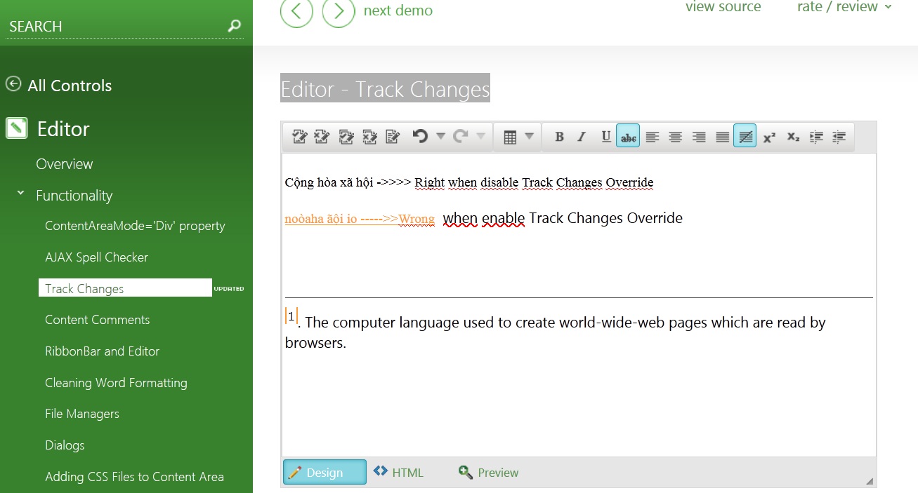 i run demos Editor - Track Changes, if i'm disable Track changes override, i can type my language Vietnamese with input method: telex and Character set: Unicode