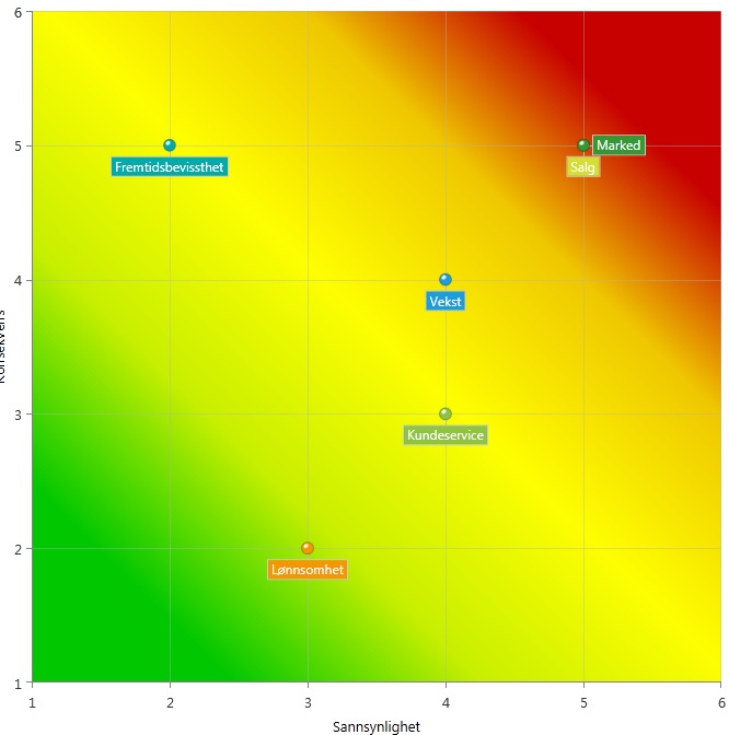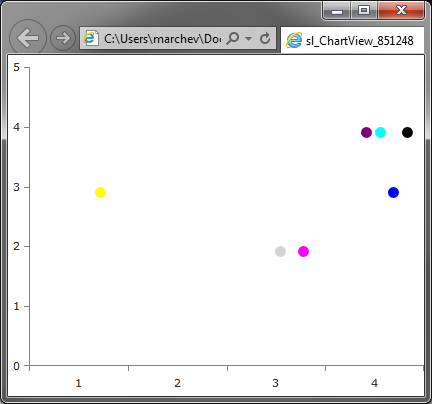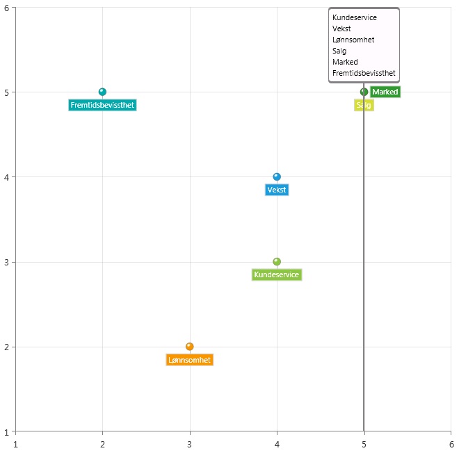 The chart in question is a risk chart where risk indicators (KPI's) have a probability value and a consequence value. These are plotted in a 2D space to visualize the severity of the risks (upper right corners are high risks). See attached file for example. These kind of risk charts is a standard way to visualize risks for risk managers/analysts. I can of course visualize this with clustered bars but the effect is not the same. If you have any pointers tips on how to visualize overlapping points - please let me know. The tooltip only displays on the topmost point, but as a simple "solution" I have put a tooltip on the LabelTemplate to give further details about the points.
