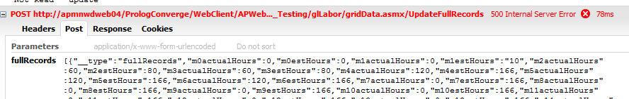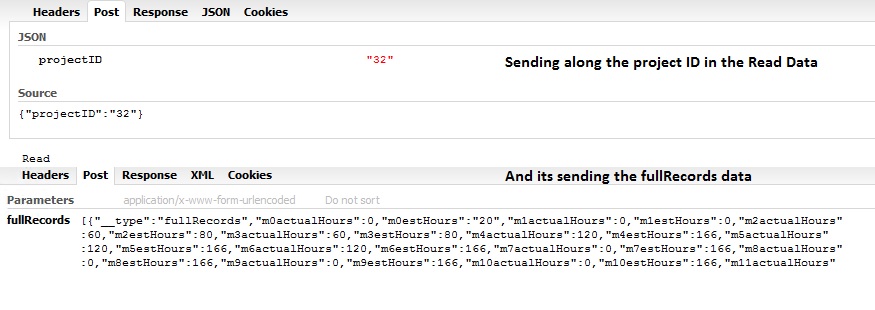 dataSource = new kendo.data.DataSource( { transport: { read: { url: baseUrl + "gridData.asmx/GetFullRecords", type: "POST", contentType: "application/json; charset=utf-8", headers: {"Accept": "application/json"} }, update: { url: baseUrl + "gridData.asmx/UpdateFullRecords", type: "POST", dataType: "json" headers: {"Accept": "application/json"} }, parameterMap: function(options, operation) { if(operation === "read") var values = {projectID: 32}; return kendo.stringify(values); } else if (operation !== "read" && options.models) { console.log("Not Read - " + operation); return{fullRecords: kendo.stringify(options.models)}; } } }, schema: { parse: function (data) { return data.d; }, model: { id: "headerID", fields: mySchemaFields } } });Attached images from firebug showing that the data looks to be the same. So not sure why it can find the method in one instance and not the other.