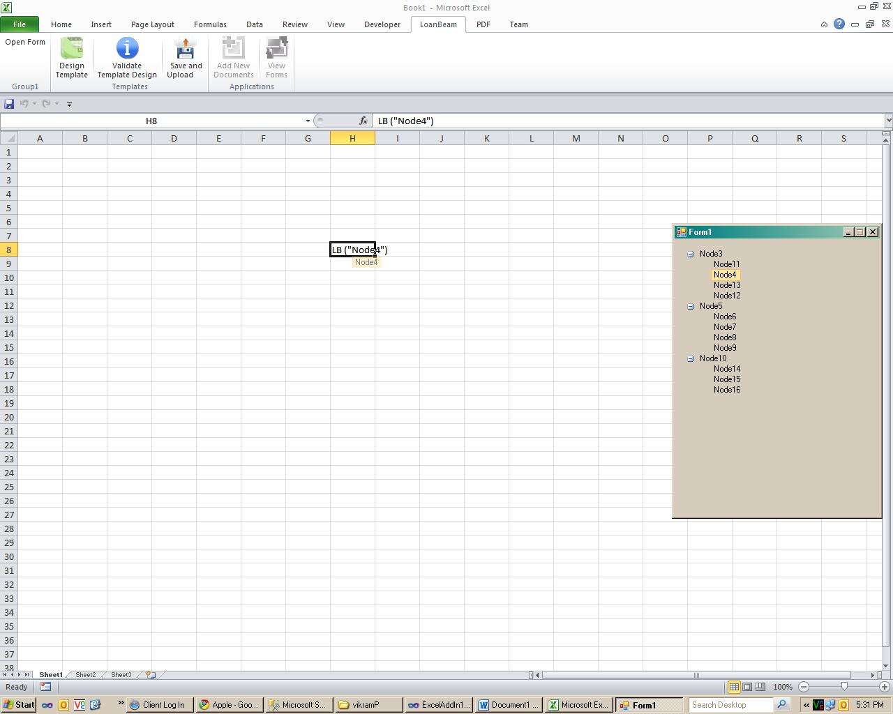 Functional working: we launch a form on clicking the button ("open form") at add-in ribbon. User will drag the tree nodes to spreadsheet cells.