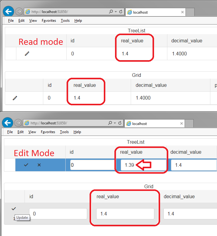<telerik:RadTreeList runat="server" DataSourceID="sql" ParentDataKeyNames="parent_id" DataKeyNames="id" Caption="TreeList" EditMode="InPlace"> <Columns> <telerik:TreeListEditCommandColumn ShowAddButton="false" /> </Columns></telerik:RadTreeList><br /><br /><telerik:RadGrid runat="server" DataSourceID="sql" AllowAutomaticUpdates="true" MasterTableView-Caption="Grid" > <MasterTableView EditMode="InPlace"> <Columns> <telerik:GridEditCommandColumn /> </Columns> </MasterTableView></telerik:RadGrid><asp:SqlDataSource runat="server" ID="sql" ConnectionString="<%$ ConnectionStrings:SqlDB%>" CancelSelectOnNullParameter="false" SelectCommand="select 0 id, convert(real, 1.4000) real_value, convert(decimal(10,4), 1.4) decimal_value, null parent_id " />