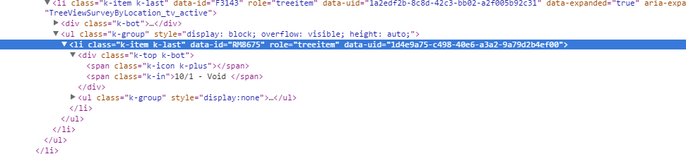 $('#TreeViewSurveyByLocation').find('li[data-id="RM8675"]');Once you have reference to the dom element its data-uid attribute could be extracted via the following code: