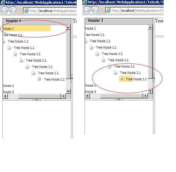 i had provided some styles for treeview highlighting, so that the entire node remains selected, instead of the text itself. But as the horizontal scrollbar starts coming in the tree, the highlighting doesnt take the entire treeview expanded width. I have attached an image of the same. The image has two images aligned horizontally, which depicts the mouse over effect when the scrollbar appears in the treeview and when u are some levels deep. I am also pasting a aspx code for the same.
