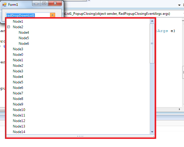 void radDropDownList1_PopupClosing(object sender, RadPopupClosingEventArgs args){ Point location = this.radDropDownList1.Popup.PointToClient(Control.MousePosition); RadElement element = this.radDropDownList1.Popup.ElementTree.GetElementAtPoint(location); if (element is SizeGripItem) { args.Cancel = true; }}You can control the drop down size by setting DropDownHeight, DropDownMinSize and DropDownMaxSize properties.