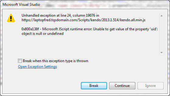 I am implementing a TreeView within a modal window. The window works fine the first time it is initialized within its containing razor view. But whenever the containing razor view is reloaded due to user navigation, I get the attached JavaScript exception within the _attachUids function shown below when the TreeView attempts its ajax call (LoadContentFrom) to my partial view. Any insight is appreciated as I am still fairly new to the TreeView.