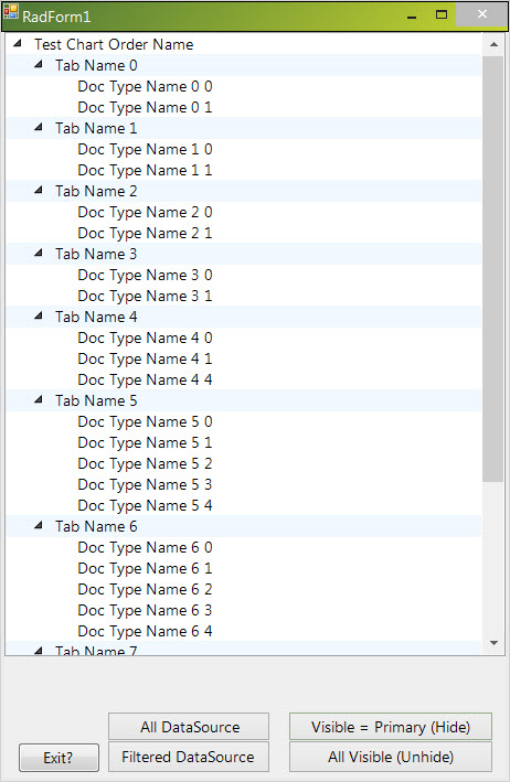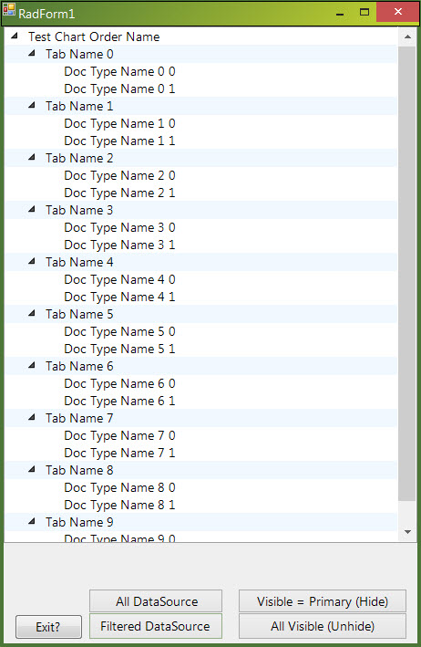 I would like to hide/unhide nodes based on a bound data source item value. In my sample project, I can assign a full data source and a filtered data source from 'All Data Source' button click or 'Filtered Data Source' button click. But hide and unhide using the node visible property in radTreeView1_NodeFormatting event triggered from the 'Visible = Primary (Hide)' and 'All Visible Unhide' don't work. Also, the first click of 'Visible=Primary(Hide)' only formats the first 5 nodes. It seems once a node's visible property is false, you can not set it to true programmatically. I do not want to refresh or reload the tree view.