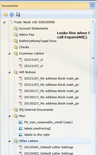 Expandall.jpg: This is how it looks if I call ExpandAll() after binding to the TreeView. This is how I would expect it to work. I need to start with the TreeView collapsed, however, due to requirements.
