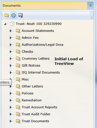 TreeViewInitialLoad.jpg: Same TreeView loaded but without ExpandAll() being called. Notice that all of the nodes have the expander icon.