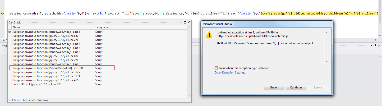 Unhandled exception at line 8, column 374994 in http://localhost:3407/Scripts/KendoUI/kendo.web.min.js