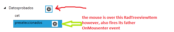 Each time the mouse is over an item I need to show an image ("Gear") beside this RadTreeviewItem. I'm showing this image with the onMouseEnter event and i'm hiding it with the onMouseLeave event. The problem is when i select a RadTreeViewItem that is inside another RadTreeViewItem. It shows its "Gear" and also its father "Gear".