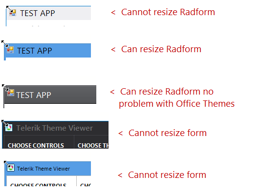 Since this is an old post and our public issue tracking system has been migrated to the feedback portal, I am posting the correct link to the previously discussed issue: https://feedback.telerik.com/winforms/1366710-fix-radform-cannot-be-resized-from-top-left-and-top-right-corners-if-theme-is-win8-or-vs2012