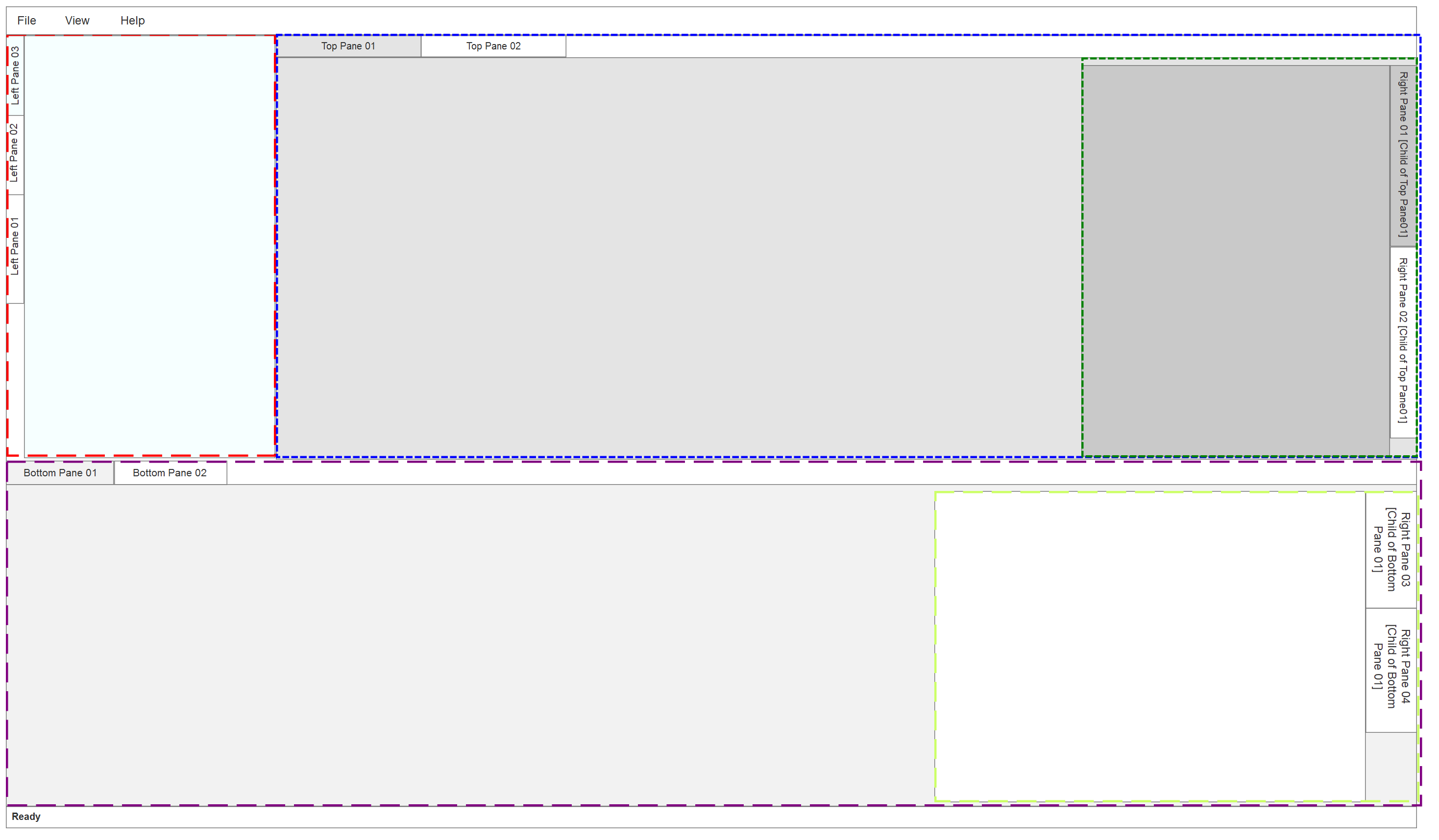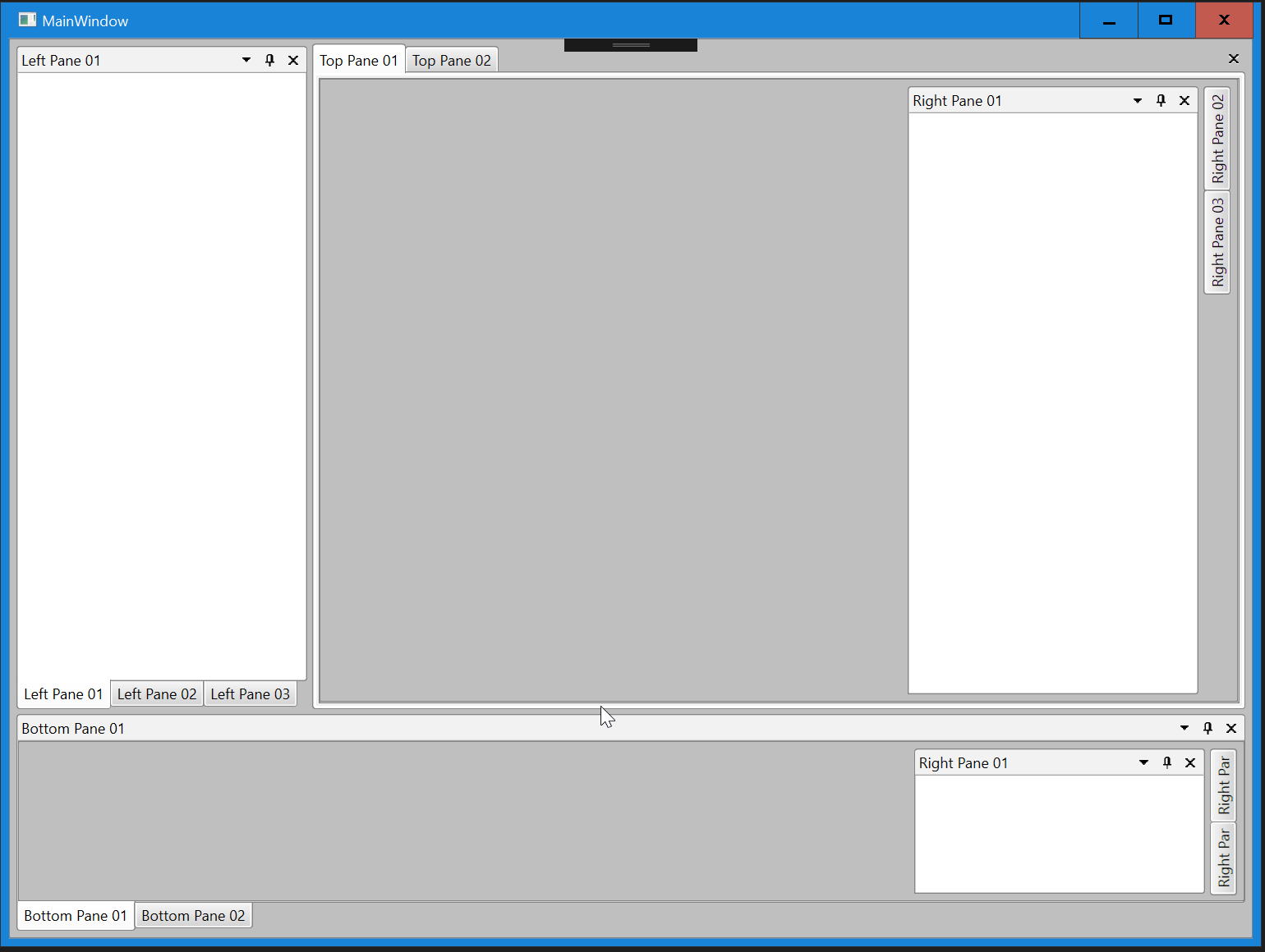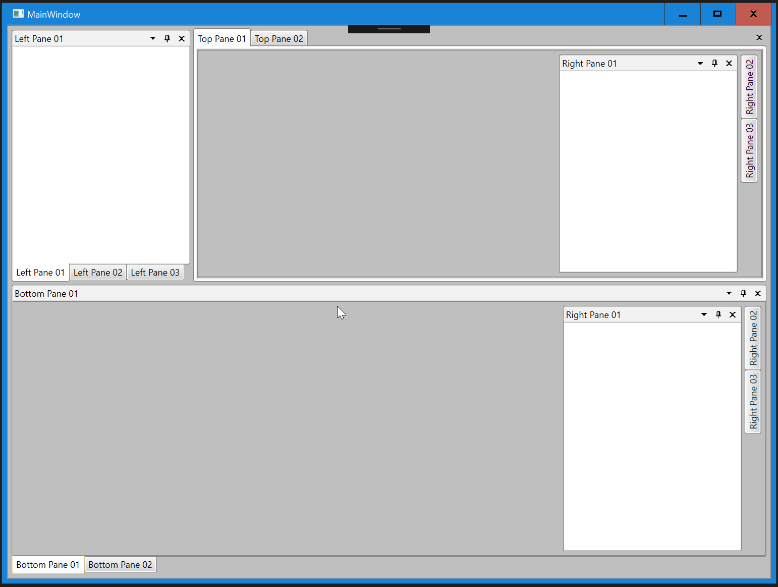 <telerik:RadDocking Grid.Row="1"> <telerik:RadDocking.DocumentHost> <telerik:RadSplitContainer> <telerik:RadPaneGroup> <telerik:RadPane Header="Top Pane 01"> <telerik:RadDocking> <telerik:RadSplitContainer InitialPosition="DockedRight"> <telerik:RadPaneGroup> <telerik:RadPane Header="Right Pane 01" IsPinned="True" /> <telerik:RadPane Header="Right Pane 02" IsPinned="False" /> <telerik:RadPane Header="Right Pane 03" IsPinned="False" /> </telerik:RadPaneGroup> </telerik:RadSplitContainer> </telerik:RadDocking> </telerik:RadPane> <telerik:RadPane Header="Top Pane 02" /> </telerik:RadPaneGroup> </telerik:RadSplitContainer> </telerik:RadDocking.DocumentHost> <telerik:RadSplitContainer InitialPosition="DockedBottom"> <telerik:RadPaneGroup> <telerik:RadPane Header="Bottom Pane 01"> <telerik:RadDocking> <telerik:RadSplitContainer InitialPosition="DockedRight"> <telerik:RadPaneGroup> <telerik:RadPane Header="Right Pane 01" IsPinned="True" /> <telerik:RadPane Header="Right Pane 02" IsPinned="False" /> <telerik:RadPane Header="Right Pane 03" IsPinned="False" /> </telerik:RadPaneGroup> </telerik:RadSplitContainer> </telerik:RadDocking> </telerik:RadPane> <telerik:RadPane Header="Bottom Pane 02" /> </telerik:RadPaneGroup> </telerik:RadSplitContainer> <telerik:RadSplitContainer InitialPosition="DockedLeft"> <telerik:RadPaneGroup> <telerik:RadPane Header="Left Pane 01" /> <telerik:RadPane Header="Left Pane 02" /> <telerik:RadPane Header="Left Pane 03" /> </telerik:RadPaneGroup> </telerik:RadSplitContainer></telerik:RadDocking>I'm attaching a sample project as well - if you have any additional questions, let me know.