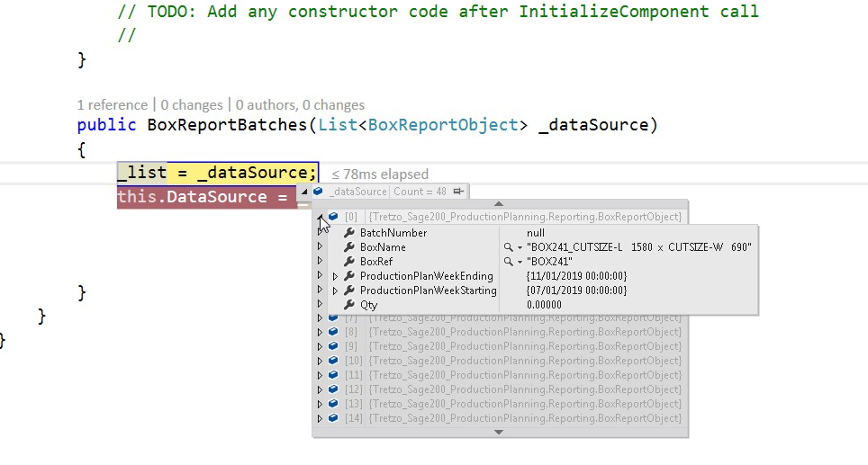public class BoxReportObject { public DateTime ProductionPlanWeekStarting { get; set; } public DateTime ProductionPlanWeekEnding { get; set; } public string BatchNumber { get; set; } public string BoxRef { get; set; } public string BoxName { get; set; } public decimal Qty { get; set; } }