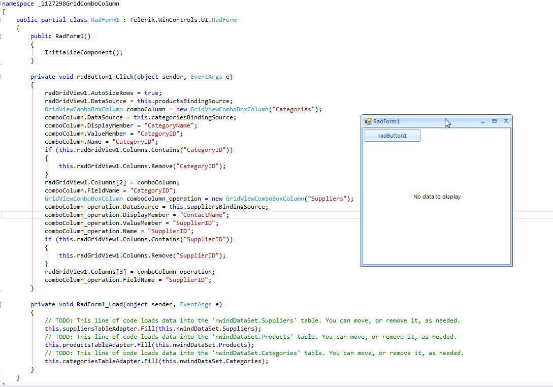 radGridView5.Invoke(new MethodInvoker(delegate () { radGridView5.AutoSizeRows = true; radGridView5.DataSource = _bindingSocOperationGrid; GridViewComboBoxColumn comboColumn = new GridViewComboBoxColumn("соц. работник"); comboColumn.DataSource = _bindingSocRabotnik; radGridView5.Columns[1] = comboColumn; comboColumn.FieldName = "fio"; GridViewComboBoxColumn comboColumn_operation = new GridViewComboBoxColumn("операция"); comboColumn_operation.DataSource = _bindingSocOperation; radGridView5.Columns[3] = comboColumn_operation; comboColumn_operation.FieldName = "operation"; }));