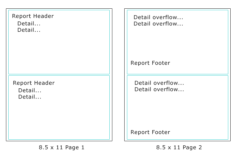 I'm creating an invoice report. It has a header, footer, and a detail section in the middle with the line items on the invoice. It's a half page report (8.5 x 5.5) that needs to print twice on one full page, and will be torn on a perforation in the middle, giving the user 2 copies. If there's not too many line items, there's no problem. However, when the line items exceed what fits on the first page, I need them to overflow to a 2nd page. I've attached an image to represent what I'm trying to do.