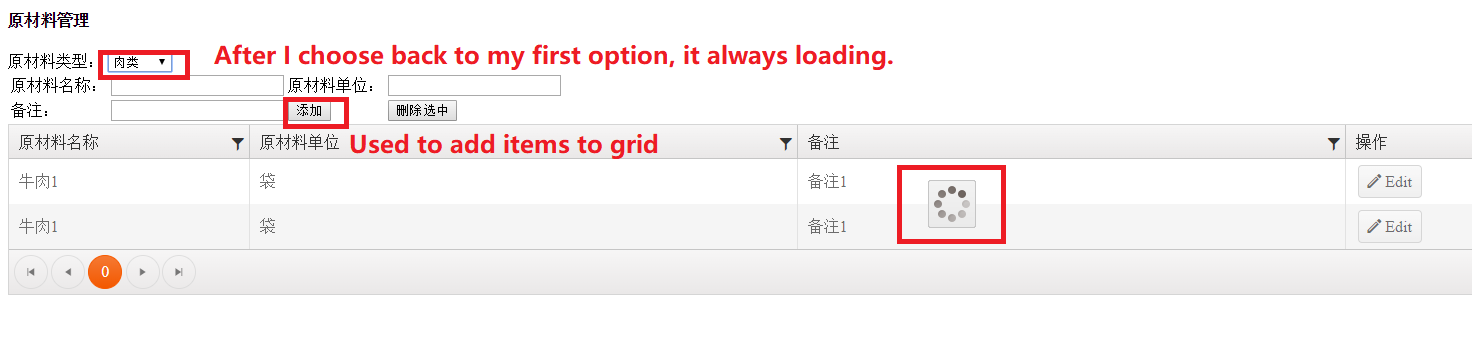 But after I choose 1 and add some items to grid 1, then choose 2 to switch to grid 2 and add some items to grid 2. Now when I switch back to grid 1, it display a loading icon always. I could not operate my grid 1 any more.