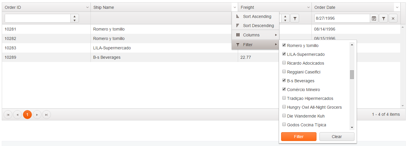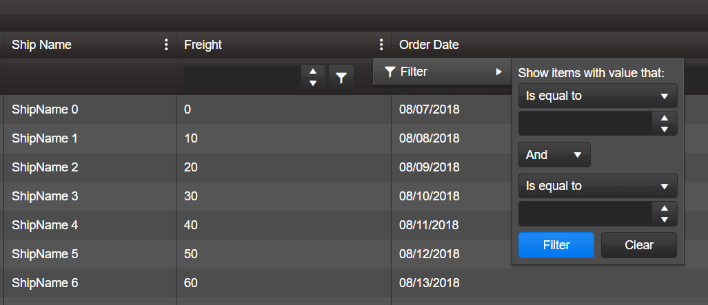 .Name("grid").Columns(columns =>{ columns.Bound(p => p.OrderID).Filterable(ftb => ftb.Cell(cell => cell.ShowOperators(false))); columns.Bound(p => p.ShipName).Width(500).Filterable( ftb => ftb. Multi(true) .Mode(GridFilterMode.Menu) .Cell(c => c.Enabled(false))); columns.Bound(p => p.Freight).Width(250).Filterable(ftb => ftb.Cell(cell => cell.Operator("gte"))); columns.Bound(p => p.OrderDate).Format("{0:MM/dd/yyyy}");}).Pageable().Sortable().Scrollable().Filterable(ftb => ftb.Mode(GridFilterMode.Row)).ColumnMenu(true)You can still use combination of filters. For example "Less Than" for the Order Date column, and selected values from the ShipName. See the screenshot as reference.