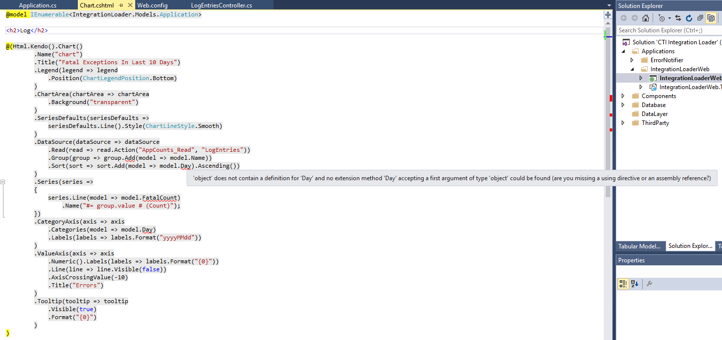 @model IEnumerable<IntegrationLoader.Models.Application>@(Html.Kendo().Chart() .Name("chart") .Title("Fatal Exceptions In Last 10 Days") .Legend(legend => legend .Position(ChartLegendPosition.Bottom) ) .ChartArea(chartArea => chartArea .Background("transparent") ) .SeriesDefaults(seriesDefaults => seriesDefaults.Line().Style(ChartLineStyle.Smooth) ) .DataSource(dataSource => dataSource .Read(read => read.Action("AppCounts_Read", "LogEntries")) .Group(group => group.Add(model => model.Name)) .Sort(sort => sort.Add(model => model.Day).Ascending()) ) .Series(series => { series.Line(model => model.FatalCount) .Name("#= group.value # (Count)"); }) .CategoryAxis(axis => axis .Categories(model => model.Day) .Labels(labels => labels.Format("yyyyMMdd")) ) .ValueAxis(axis => axis .Numeric().Labels(labels => labels.Format("{0}")) .Line(line => line.Visible(false)) .AxisCrossingValue(-10) .Title("Errors") ) .Tooltip(tooltip => tooltip .Visible(true) .Format("{0}") ))