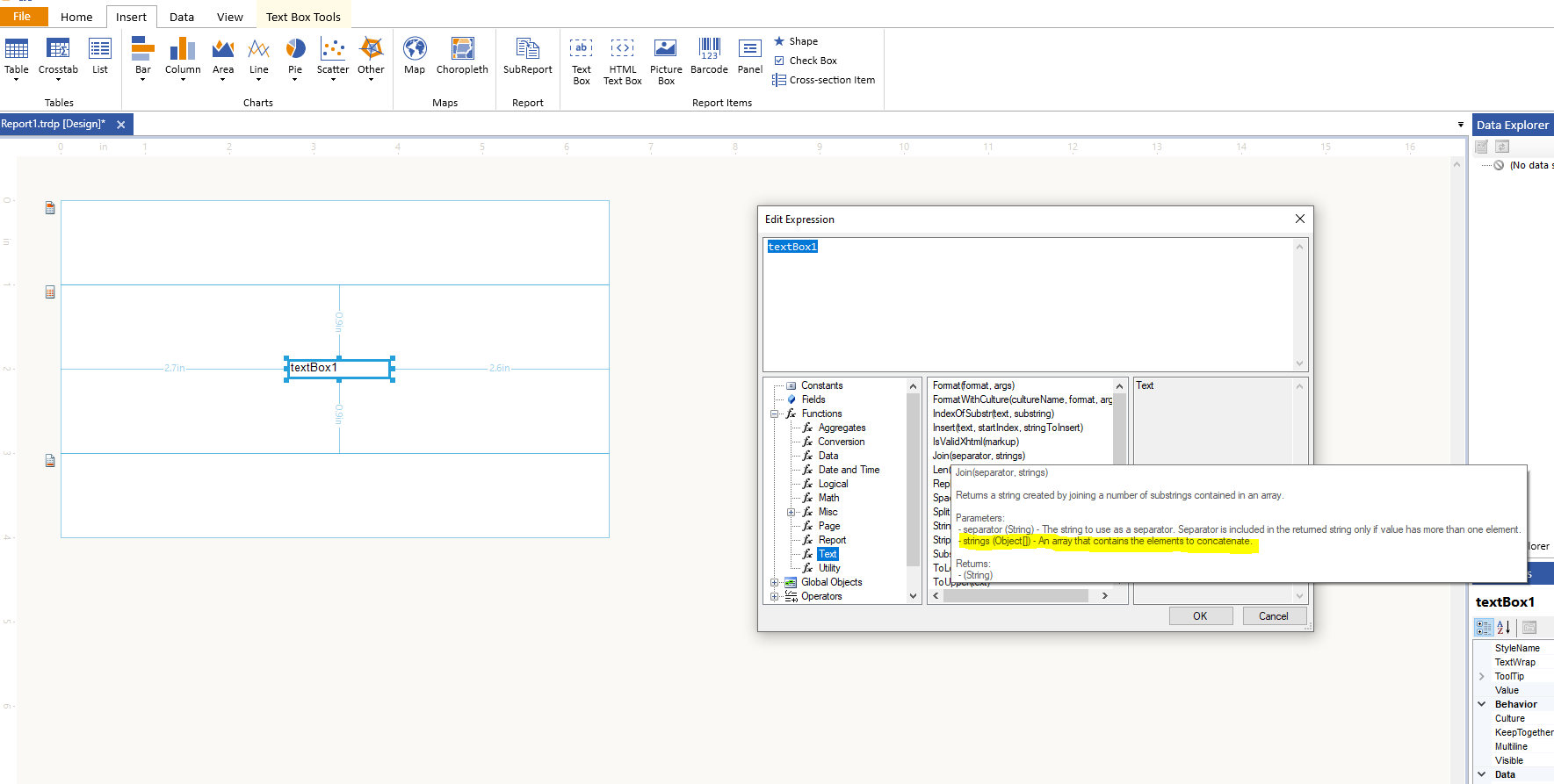 Let me start with the technical issue. Note that you have to pass the strings in an array - see the attached screenshot JoinTextFunction.PNG. If you would prefer to pass the strings directly, you may do this through the Array Utility function. Here is a sample Expression: