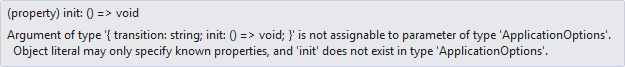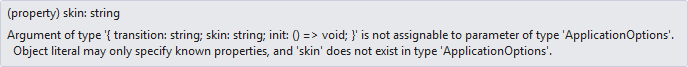 var app = new kendo.mobile.Application(document.body, { transition: 'slide', skin: 'nova', init: function () { //don't do this for android, causes issues with scrollView and swiping kendo.UserEvents.defaultThreshold(kendo.support.mobileOS.device === 'android' ? 0 : 20); }});This code works fine when I run it in JavaScript, but after trying it in TypeScript and I getting compiler errors - it's complaining about the "skin" and "init" options. The errors are shown in the attached images (skin.png and init.png). The skin configuration option is shown in the Kendo docs (http://docs.telerik.com/kendo-ui/api/javascript/mobile/application#configuration-skin), so is it just a matter of the type definition file being incorrect? Or is there something else I need to do?