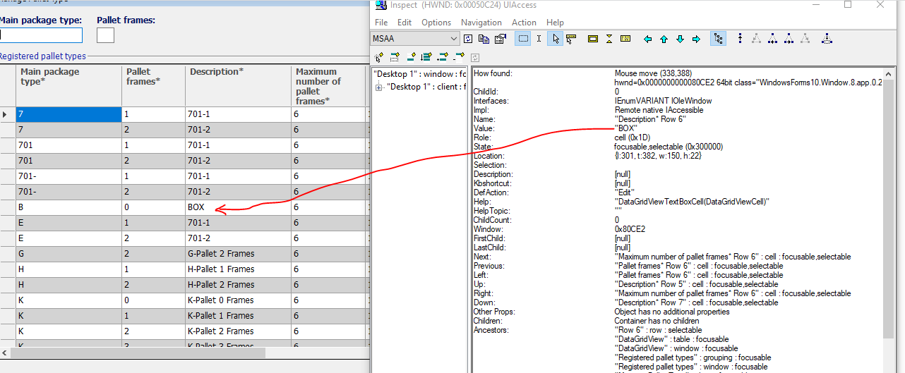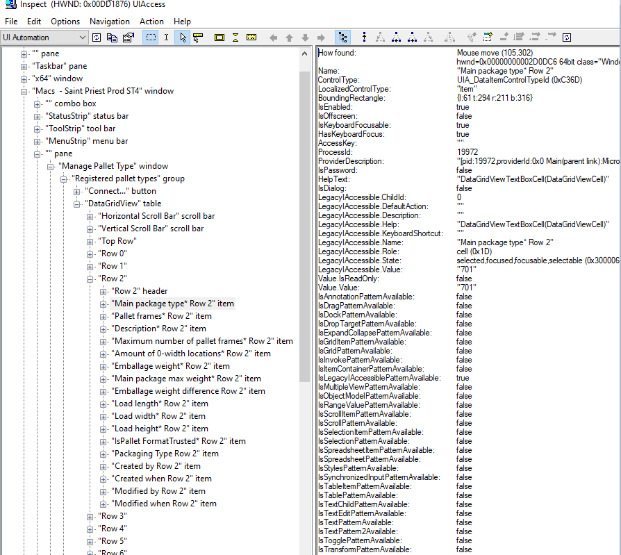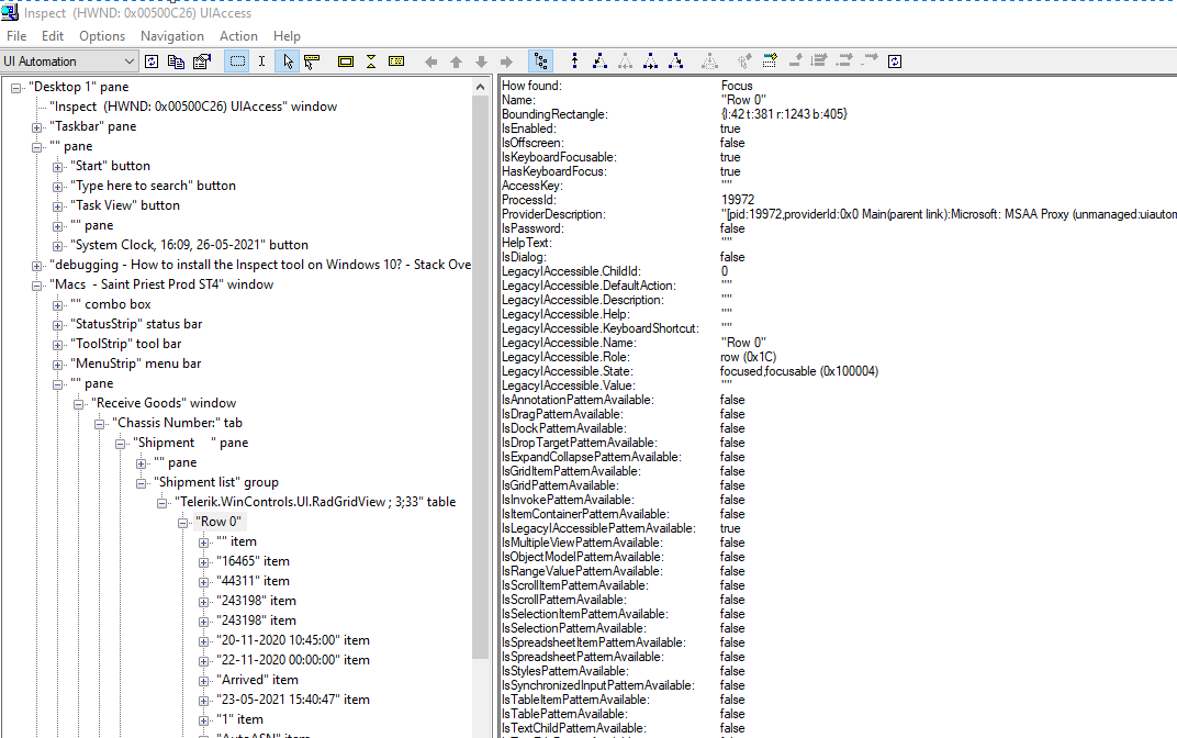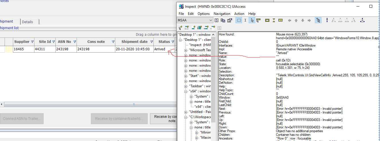 Expectation would be, Row0/1(based on indexing logic), column 'Status' and text/value "Arrived". However, it doesn't work so! Ranorex thinks, its something to discuss with Telerik. They asked to test it using 'inspect.exe' tool from win10 sdk. We tried and got same result. Below is the screenshot of result form inspect.exe