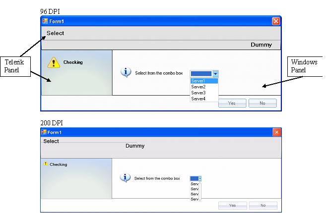 I have an application developed in vb.net 2005 and using Telerik RadControls for WinForms 2008 Q3 Sp2. I have two types of panel controls (RadPanel for gradient back color and system panel control) used on the form (windows form). I set the form's "AutoScaleMode" to "DPI".