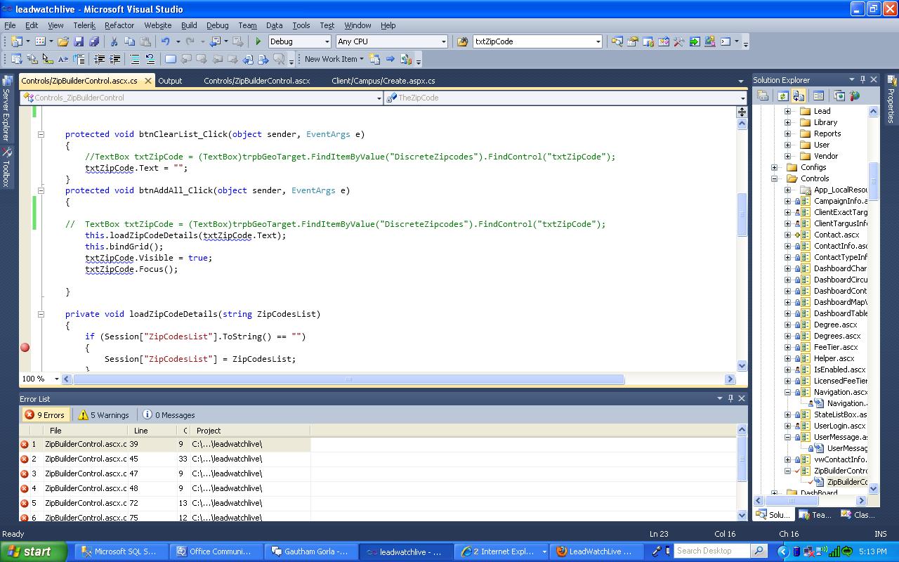 <asp:UpdatePanel runat="server" ID="upZipCodes" UpdateMode="Conditional"> <ContentTemplate> <br /> <br /> <telerik:RadAjaxPanel ID="GeoTarget" runat="server"> <telerik:RadPanelBar runat="server" ID="trpbGeoTarget" ExpandMode="SingleExpandedItem"> <Items> <telerik:RadPanelItem Expanded="True" Text="Discreate ZipCodes List" runat="server" Selected="true"> <Items> <telerik:RadPanelItem Value="DiscreateZipCodes" runat="server" Expanded="true"> <ItemTemplate> <div class="text" style="background-color: #edf9fe"> <asp:Panel runat="server" ID="pnlDiscrete"> <table border="1" style="width: 790px; height: 476px;"> <tr> <td class="style17"> <asp:Label ID="Label4" runat="server" SkinID="InputRegular">Discrete List:</asp:Label> </td> </tr> <tr> <td class="style26"> <asp:Button ID="btnAddAll" runat="server" OnClick="btnAddAll_Click" Style="z-index: 1; left: 83px; top: 2px; position: relative; width: 105px; height: 26px;" Text=" Add ZipCodes " ToolTip="Click here to Add zipcode in List" /> <asp:Button ID="btnClearList" runat="server" OnClick="btnClearList_Click" Style="z-index: 1; top: 3px; position: relative; width: 74px; left: 175px" Text="Clear List" ToolTip="It Removes all ZipCode from List" /> </td> </tr> <tr> <td align="left"> <asp:TextBox ID="txtZipCode" runat="server" Height="47px" SkinID="Long" TextMode="MultiLine" ToolTip="Enter ZipCodes" Width="454px"></asp:TextBox> <uc2:Helper ID="Helper3" runat="server" ResourceKey="ZipCode" /> <ajaxToolkit:FilteredTextBoxExtender ID="Validatior" runat="server" FilterType="Custom, Numbers" TargetControlID="txtZipCode" ValidChars="," /> <asp:RequiredFieldValidator ID="rfvZip" runat="server" ControlToValidate="txtZipCode" Display="Dynamic" ErrorMessage="* Enter Comma Sepertaed ZipCodes" SetFocusOnError="true" SkinID="ClientMessaging"></asp:RequiredFieldValidator> </td> </tr> <tr> <td align="left"> <asp:Panel ID="pnlGeoTargetProfile" runat="server" ScrollBars="Both"> <asp:GridView ID="grdZipDiscreateList" runat="server" AutoGenerateColumns="False" DataKeyNames="ZipCode" EnableModelValidation="True" RowStyle-Height="1px" ShowFooter="True" SkinID="view" Width="779px" AllowPaging="True" overflow="auto" ScrollBars="Both"> <Columns> <asp:BoundField DataField="ZIPCode" HeaderText="ZipCode" ReadOnly="true" /> <asp:BoundField DataField="City" HeaderText=" City Name" ReadOnly="true" /> <asp:BoundField DataField="State" HeaderText="State" ReadOnly="true" /> <asp:TemplateField HeaderText="Action" ItemStyle-HorizontalAlign="Center"> <ItemTemplate> <asp:Panel ID="pnlDelete" runat="server"> <asp:LinkButton ID="lnkRemove" runat="server" CommandArgument='<%# DataBinder.Eval(Container.DataItem, "ZIPCode") + "," + DataBinder.Eval(Container, "RowIndex") %>' OnClientClick="return confirm('Are you remove want to remove this ZipCode from the Discrete list ? Do you wish to continue.');" Text="Remove"><img alt="" src="../Images/Icons/remove.png" border="0" title="remove"></asp:LinkButton> </asp:Panel> </ItemTemplate> <ItemStyle HorizontalAlign="Center" /> </asp:TemplateField> </Columns> <RowStyle Height=".5px" /> </asp:GridView> </asp:Panel> </td> </tr> <tr> <td> <asp:Button ID="btnSave" runat="server" SkinID="btnSave" Text=" Updates ZipCodes " ToolTip="Click here to Update zipcodes in List" ValidationGroup="ClientDegree" Width="157px" /> <asp:Button ID="btnCleargrid" runat="server" OnClick="btnCleargrid_Click" Style="z-index: 1; left: 140px; top: 0px; position: relative; width: 133px; height: 26px" Text="Delete All ZipCodes" ToolTip="It Removes all ZipCode from List" /> <asp:Button ID="btnClose" runat="server" OnClick="btnClose_Click" Style="z-index: 1; left: 186px; top: 0px; position: relative; width: 52px; height: 26px" Text="Close" /> </td> </tr> </table> </asp:Panel> </div> <ul class="formList" id="accountInfo"> </ItemTemplate> </telerik:RadPanelItem> </Items> </telerik:RadPanelItem> <telerik:RadPanelItem Expanded="True" Text="States List" runat="server" Selected="true"> <Items> <telerik:RadPanelItem Value="States List" runat="server"> <ItemTemplate> <div class="text" style="background-color: #edf9fe"> </div> <ul class="formList" id="accountInfo"> <asp:Panel runat="server" ID="pnlStateList"> <table border="1"> <tr> <td class="style15"> <uc1:campus ID="campus" runat="server" /> </td> </tr> </table> </asp:Panel> </ItemTemplate> </telerik:RadPanelItem> </Items> </telerik:RadPanelItem> <telerik:RadPanelItem Expanded="True" Text="ZipCodes Within Radius" runat="server" Selected="true"> <Items> <telerik:RadPanelItem Value="ZipCodes in Radius" runat="server"> <ItemTemplate> <ul class="formList" id="accountInfo"> <asp:Panel ID="pnlMiles" runat="server"> <table border="1"> <tr> <td class="style25"> <asp:Label ID="lblZipCodes" runat="server" Text="ZipCodes within: "></asp:Label> <asp:TextBox ID="txtMiles" runat="server" Width="32px"></asp:TextBox><asp:RequiredFieldValidator ControlToValidate="txtMiles" ID="RequiredFieldValidator3" runat="server" Display="Dynamic" ErrorMessage="* Enter Miles" SetFocusOnError="true" SkinID="ClientMessaging" ValidationGroup="ClientDegree"></asp:RequiredFieldValidator> <asp:Label ID="lblMilesOfRadious" runat="server" Text="Miles Of Radius: "></asp:Label> <asp:TextBox ID="txtZipInMiles" runat="server" Width="90px"></asp:TextBox> <uc2:Helper ID="Helper4" runat="server" ResourceKey="ZipCode" /> <asp:RequiredFieldValidator ControlToValidate="txtZipInMiles" ID="RequiredFieldValidator4" runat="server" Display="Dynamic" ErrorMessage="* Enter Numric ZipCodes" SetFocusOnError="true" SkinID="ClientMessaging" ValidationGroup="ClientDegree"></asp:RequiredFieldValidator> <ajaxToolkit:FilteredTextBoxExtender ID="FilteredTextBoxExtender1" runat="server" FilterType="Custom, Numbers" TargetControlID="txtZipInMiles" ValidChars="," /> </td> </tr> </table> </asp:Panel> </ItemTemplate> </telerik:RadPanelItem> </Items> </telerik:RadPanelItem> </Items> <CollapseAnimation Duration="100" Type="None" /> <ExpandAnimation Duration="100" Type="None" /> </telerik:RadPanelBar> </telerik:Ra