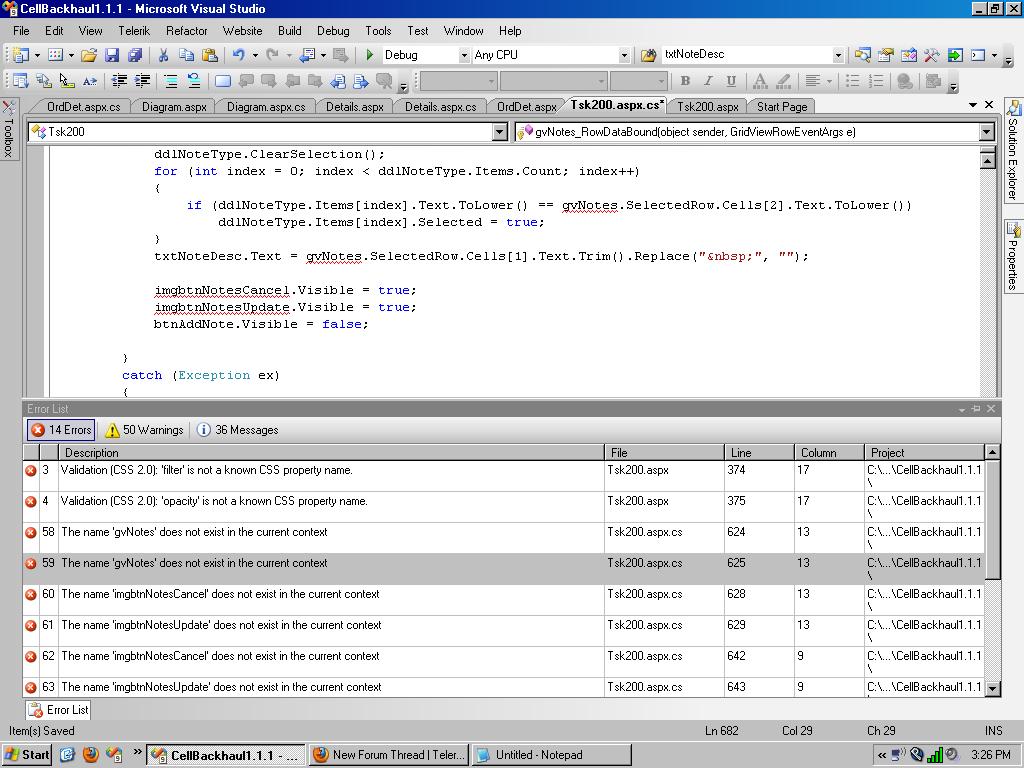 I implemented radtab inside radgrid. I have have couple of image buttons and asp.net gridview inside RadPageView. in codebehind when i am trying to access those imagebuttons or gridview with id I am getting error like The name 'imgbtnNotesCancel' does not exist in the current context for gridview The name 'gvNotes' does not exist in the current context. Please see the image below. Here is my code. WHat causing the problem. Please help me to fix this. (i tried it by replacing gridview with radgrid still same issue.)