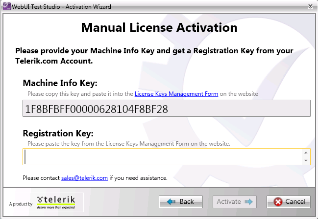 My apologies for the trouble. Due to some WPF theme issue the TextBox for the RegistrationKey field is not visible. You can activate using the "Automatic" process or download the latest internal build from here: http://www.telerik.com/account/your-products/internal-builds.aspx where the problem is solved.