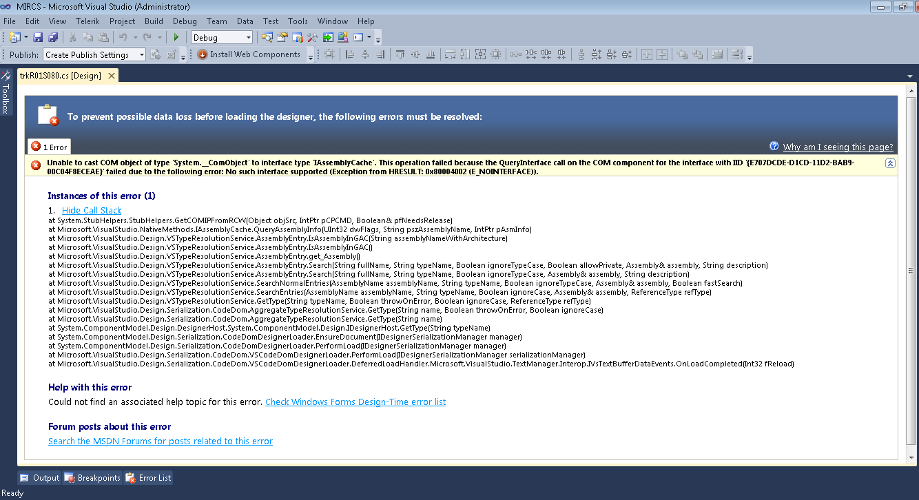 Recently I have downloaded the trial version (Q2_2015_SP1) of Telerik reporting. When i try to add a report to my project either i choose Blank Report or is select Reporting Wizard, i could not be able to add it, and visual studio displays: "To prevent the data loss before loading the designer, following error must be resolved". I have attached the image of error that visual studio shows.