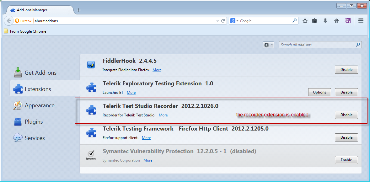 [05/15 11:35:58,Telerik.TestStudio.exe(12780:1),Error] RegistryHelper.PerformActionOnCurrentKey() : Cannot locate SOFTWARE\Mozilla\Mozilla Firefox\extensions[05/15 11:35:58,Telerik.TestStudio.exe(12780:1),Error] RegistryHelper.PerformActionOnCurrentKey() : Cannot locate SOFTWARE\Mozilla\Mozilla Firefox\extensionsIt seems there are some problems with the Firefox extensions. Please try to reinstall the extensions as shown in this article. Also from the video I can see that you have a lot of plugins, please try to disable them all for testing purposes to see if you will start capturing traffic. Some of them might be interfering with our extensions.