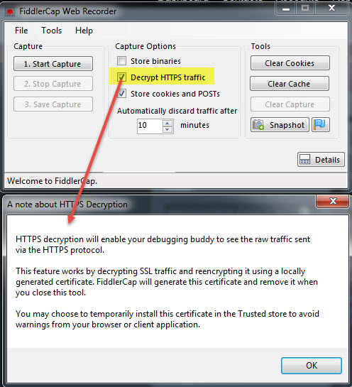 I have installed the Fiddler Cap but it doesn't capture the HTTPS traffic of the web application.