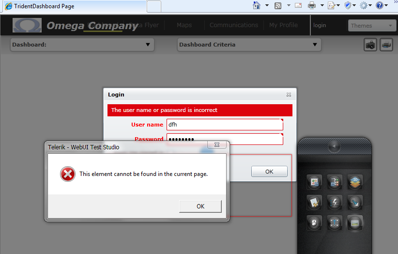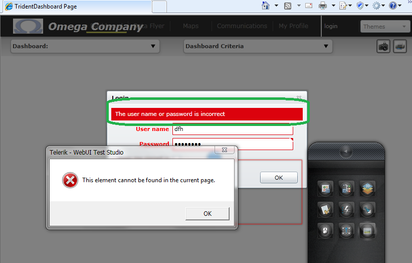 What steps did you perform that led up to the "This element cannot be found..." error message? What are you actually trying to capture... is it the "The user name or password is incorrect" warning message? Would it be possible for us to direct access your application so we can investigate what's going on first hand?