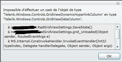 {System.InvalidCastException: Impossible d'effectuer un cast de l'objet de type 'Telerik.Windows.Controls.GridViewDynamicHyperlinkColumn' en type 'Telerik.Windows.Controls.GridViewDataColumn'. à mesespacesclos.RadGridViewSettings.SaveState() à mesespacesclos.RadGridViewSettings.grid_Unloaded(Object sender, RoutedEventArgs e) à MS.Internal.CoreInvokeHandler.InvokeEventHandler(Int32 typeIndex, Delegate handlerDelegate, Object sender, Object args) à MS.Internal.JoltHelper.FireEvent(IntPtr unmanagedObj, IntPtr unmanagedObjArgs, Int32 argsTypeIndex, Int32 actualArgsTypeIndex, String eventName)}
