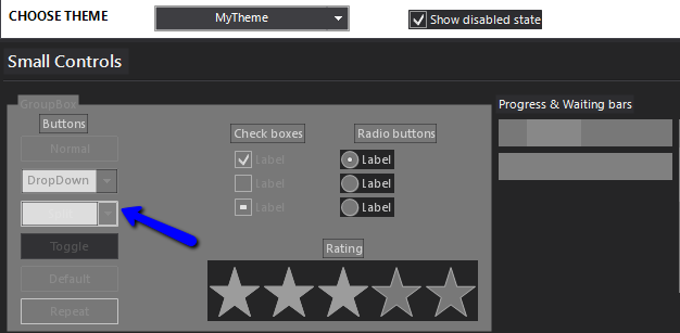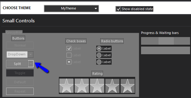 Starting from the theme Visual Studio 20012 Dark, I have changed all settings in a radsplitButton.disabled to be the same of the normal status.