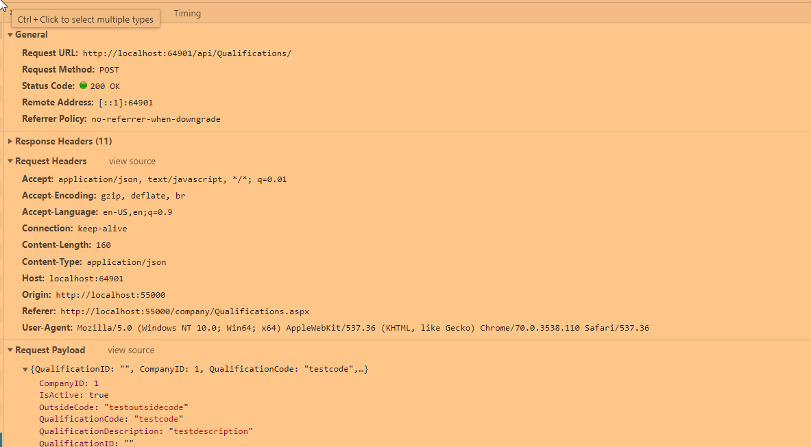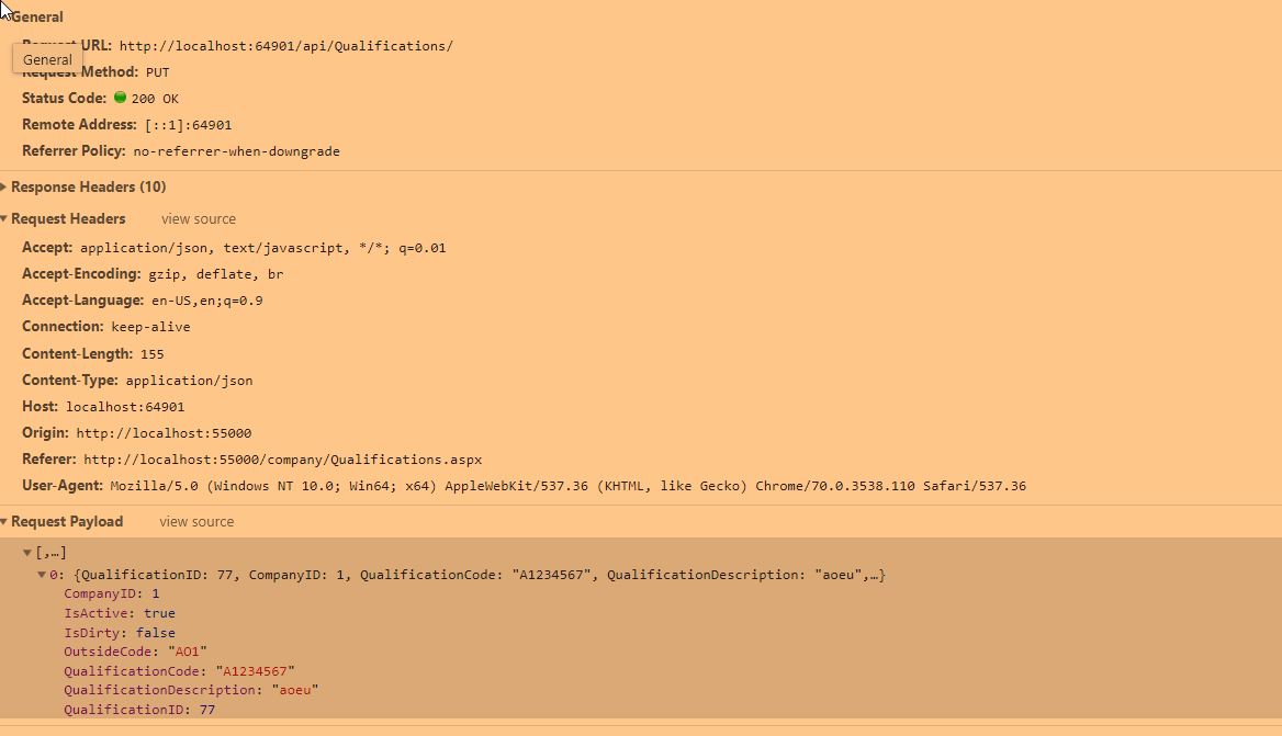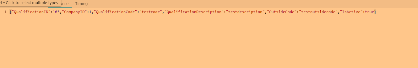 var datasource = new kendo.data.DataSource({ transport: { read: { url: baseApiURL + companyID, type: "get", dataType: 'json' }, update: { url: baseApiURL, type: "put", dataType: 'json', contentType: "application/json" }, create: { url: baseApiURL, type: "post", dataType: 'json', contentType: "application/json" }, parameterMap: function (options, operation) { if (operation !== "read" && options) { var loptions = []; loptions[0] = options; // place json object in array to meet requirements of API if (operation == "update") { return JSON.stringify(loptions); } if (operation == "create") { return JSON.stringify(loptions); } if (operation == "destroy") { return JSON.stringify(loptions); } } } }, schema: { data: "objResultList", model: { id: "QualificationID", fields: { QualificationID: {}, CompanyID: { defaultValue: companyID }, QualificationCode: {}, QualificationDescription: {}, OutsideCode: {}, IsActive: {} } } } });Response from the server