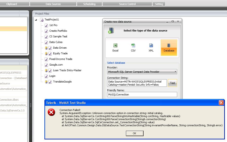I'm using trial version of QA edition Q3 release. trying to connect to database SQL Server Express Edition 2008 getting below error? as any one successfully connected to database? Please help me!!!