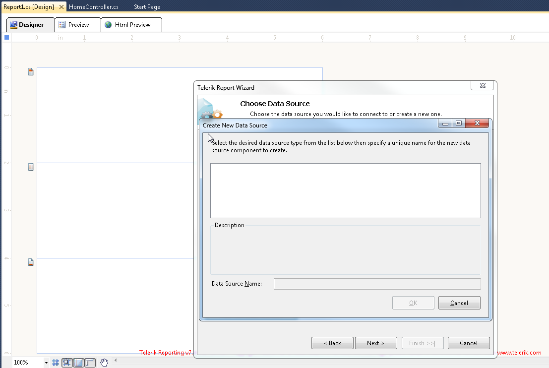 Add folder in VS project --> add new item --> telerik report -->(report wizzard poped up) --->new report --> next -->add new data source --> the select window is empty (should show some select option like sqldata client something) datasource name is disabled) --> cancel to exit wizzard