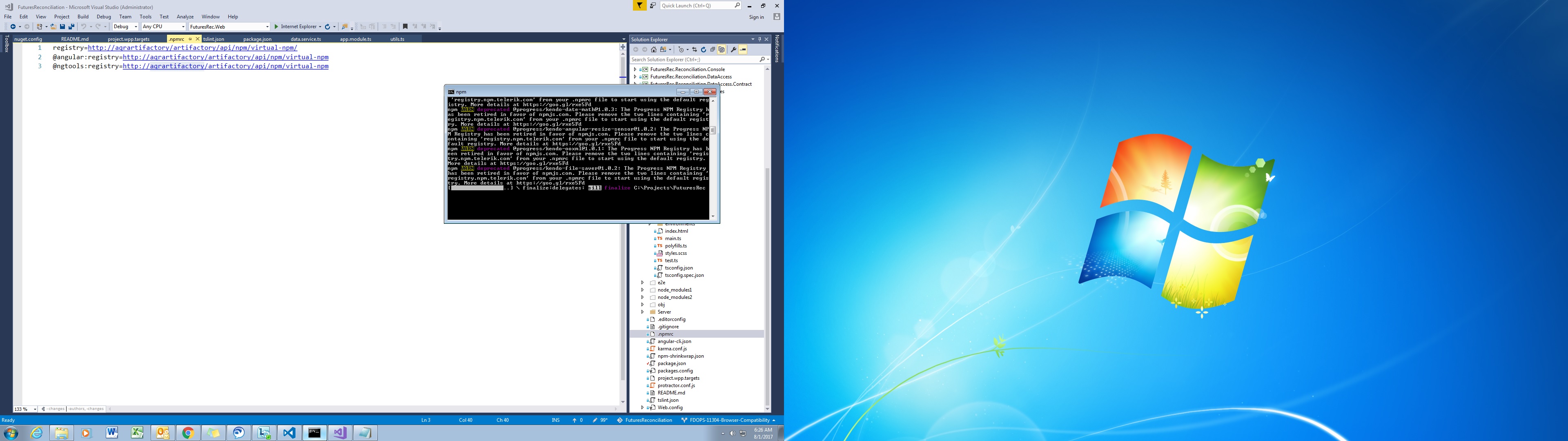 After removing those two lines in .npmrc you should be able to successfully install the Kendo UI package through NPM. More information regarding this error can be found in the NPM Packages Documentation.