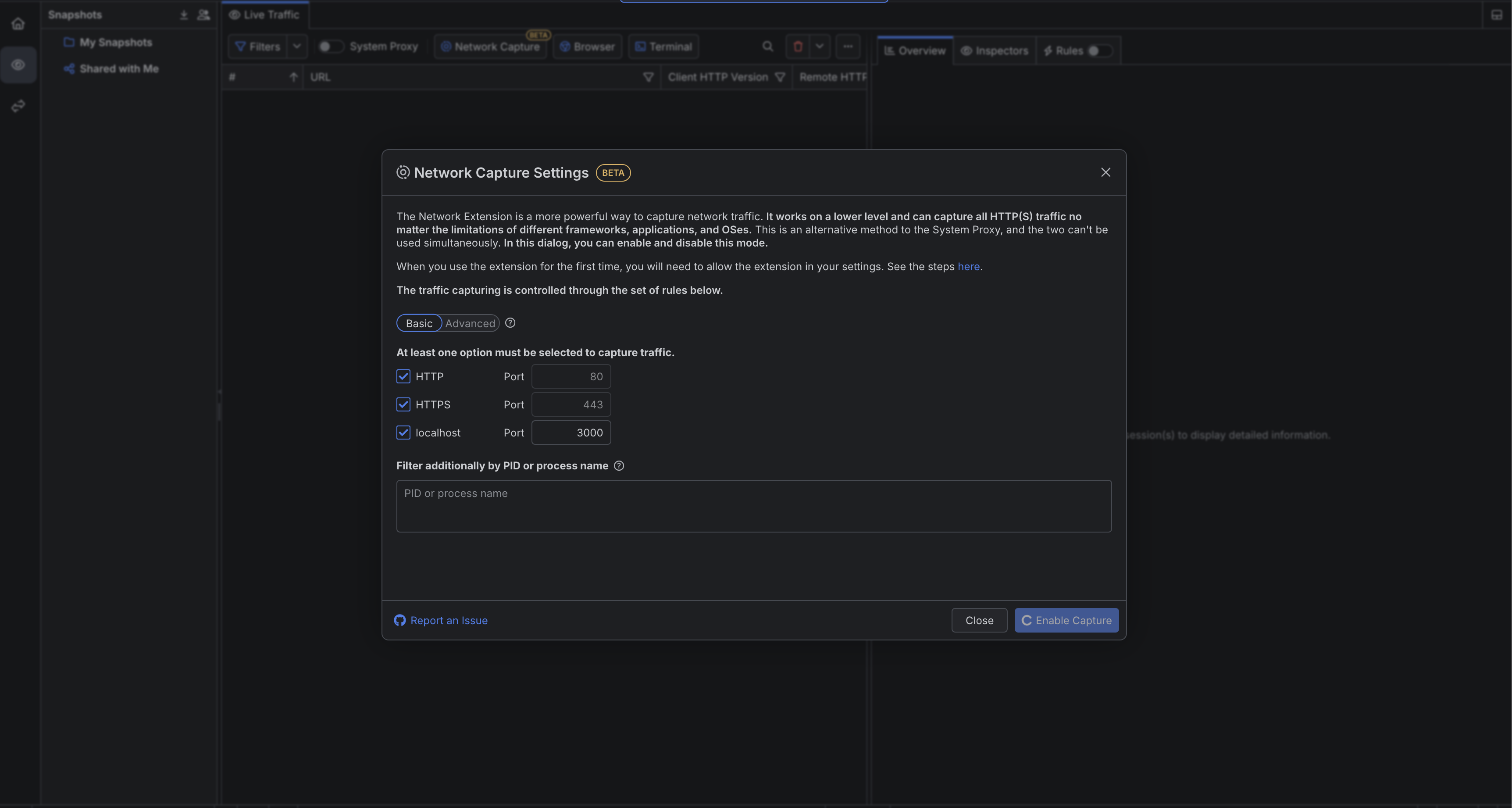 - Start the network capturing by clicking the "Enable Capture" button.