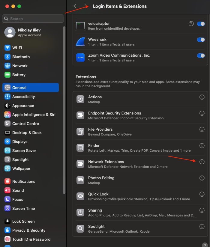 3. Scroll to the "Network Extensions" section and click the Info button.