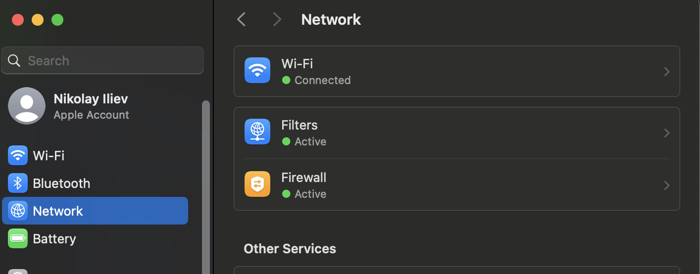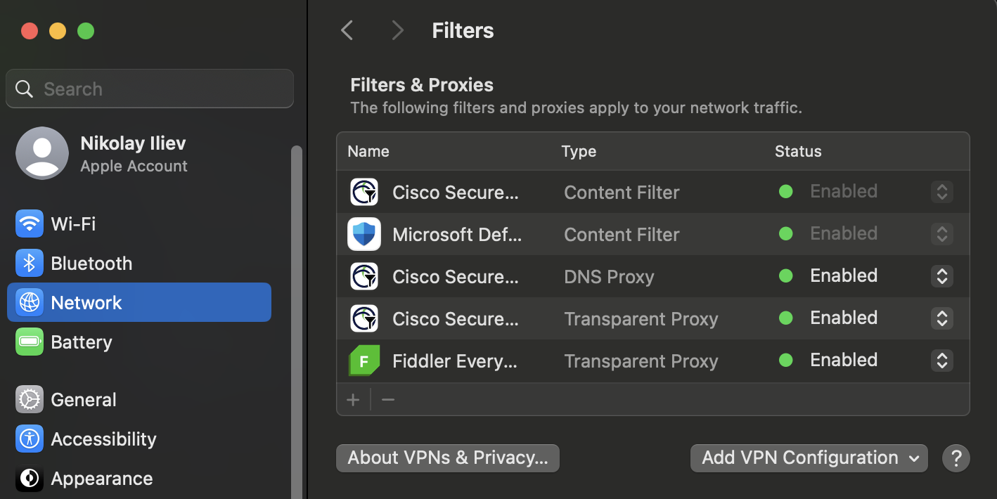 You can also check if the Fiddler Everywhere network extension is installed and enabled through the macOS > Settings > Network > Filters screen, which should look similar to the following one: