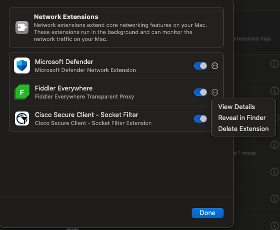 - Uninstall the Fiddler Everywyere application - this will also uninstall the network extension. Details are available here.