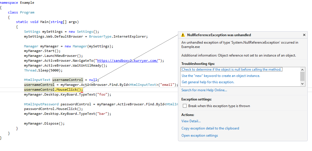 The problem is that if I run this against a local testing site it works perfectly. However if I try to run it against a site (an identical copy) on a remote server, the framework can't find the controls and I get a null reference exception because the object "usernameControl" is null.