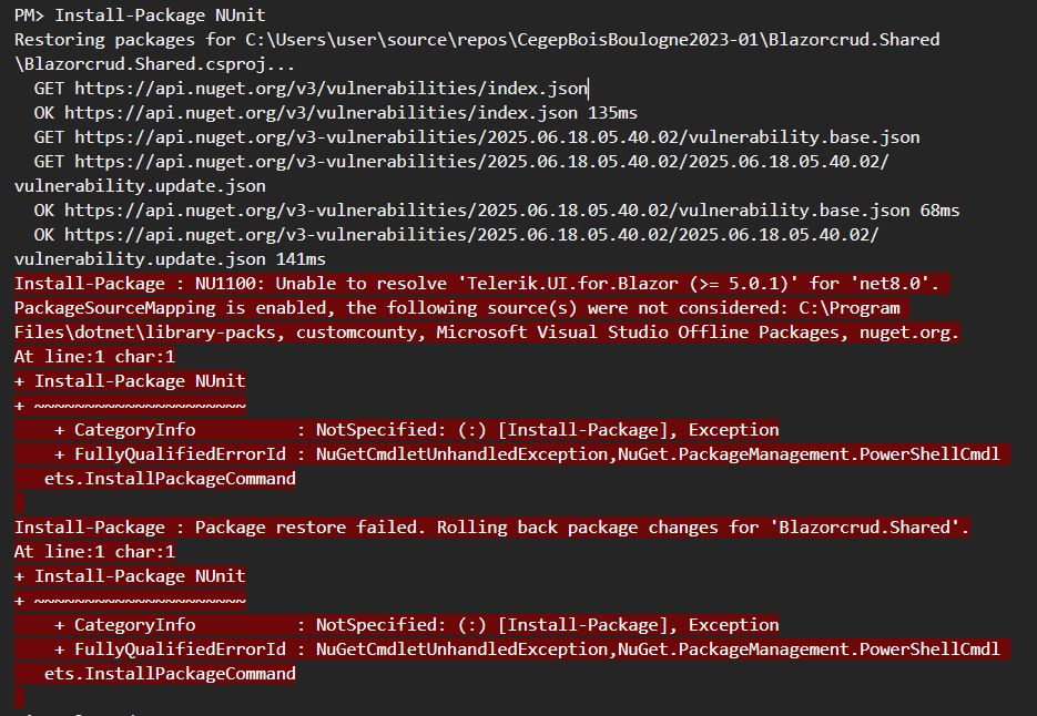 I am unable to restore NuGet packages for my Blazor project using Telerik UI for Blazor.
