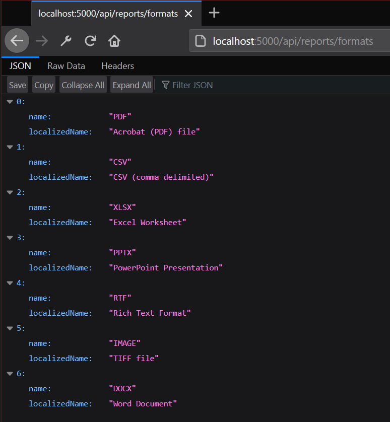 The /api/reports/formats route is a public route that can be used to test in the browser or with an API testing tool to verify that the Reporting REST Service is working properly. If it is a JSON object of the available formats will be returned. See the following screenshot for reference.