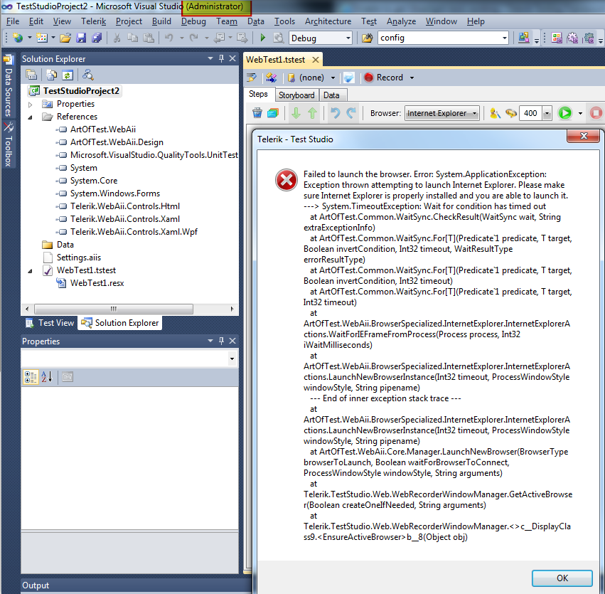 <?xml version="1.0" encoding="utf-8" ?><configuration> <configSections> <section name="WebAii.Settings" type="ArtOfTest.WebAii.Core.SettingsConfigSectionHandler, ArtOfTest.WebAii, Version=2011.2.1117.0, Culture=neutral, PublicKeyToken=4fd5f65be123776c"/> <section name="WebAii.Settings.Web" type="ArtOfTest.WebAii.Core.WebSettingsConfigSectionHandler, ArtOfTest.WebAii, Version=2011.2.1117.0, Culture=neutral, PublicKeyToken=4fd5f65be123776c"/> </configSections> <WebAii.Settings annotateExecution="true" annotationMode="All" clientReadyTimeout="60000" createLogFile="true" executionDelay="0" executionTimeout="20000" logAnnotations="false" logLocation="E:\WebAiiLogs\" queryEventLogErrorsOnExit="true" simulatedMouseMoveSpeed="0.3" unexpectedDialogAction="HandleAndFailTest" waitCheckInterval="500" /> <WebAii.Settings.Web aspNetDevServerPort="-1" baseUrl="https://askmartytest.lmi.org/" defaultBrowser="InternetExplorer" enableScriptLogging="false" enableSilverlight="false" enableUILessRequestViewing="false" killBrowserProcessOnClose="true" localWebServer="None" recycleBrowser="true" silverlightApplicationPath="" silverlightConnectTimeout="30000" useHttpProxy="false" verboseHttpProxy="false" webAppPhysicalPath="C:\Aot\webtest\artoftest.testing\pages" /></configuration>As for the IE launching and recording problem, have you already tried following this troubleshooting guide? Let me know and we'll continue working on resolving your problems. Regards,