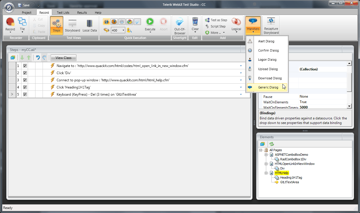 We have a generic dialog handler which is pretty good for basic operations like clicking OK, CANCEL, etc. They way you use is, you record your test up to the point where you know the Dialog will pop-up and at that point add a Generic Dialog Handler to your test. You add it from the Handlers tab in WebUI Test Studio (see screenshot 1); Check out our User Manual to see how it's used:http://www.telerik.com/documents/automated-testing-tools/WebUITestStudioQAEditionStepByStep.pdf