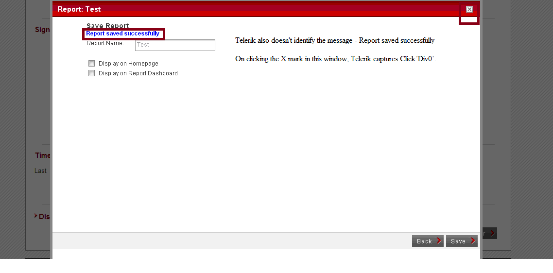 Hit the url of the application a web page is displayed. Suppose there is a link-create new and on clicking create new a popup opens in the Iframe. Now in that Iframe there are two buttons - Run and Save. On clicking Save the UI changes in that Iframe. There is a text box in which we can specify the name. After that we click on Save button. Then a message is displayed - Saved successfully. After that we click on X mark on the top of the Iframe to close it.